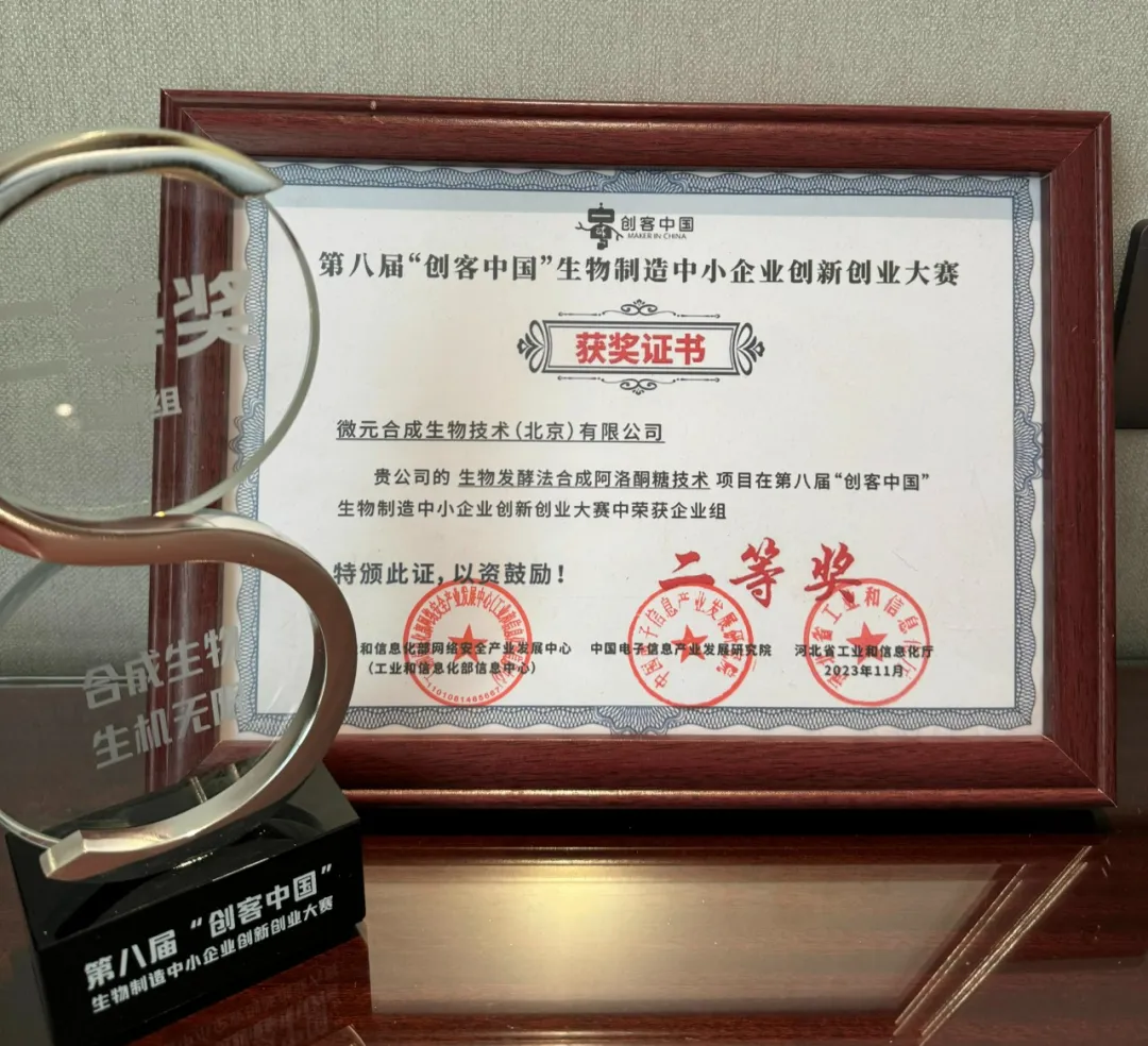 同时,第八届“创客中国”生物制造专题赛总决赛颁奖仪式也在大会现场举行,微元合成凭借“生物发酵法合成阿洛酮糖技术”斩获大赛企业组二等奖。