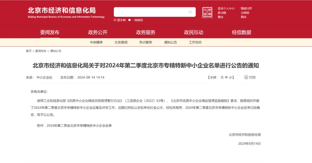 2024年8月14日,北京市经济和信息化局发布《关于对2024年第二季度北京市专精特新中小企业名单进行公告的通知》,微元合成获北京市2024年专精特新中小企业认定。